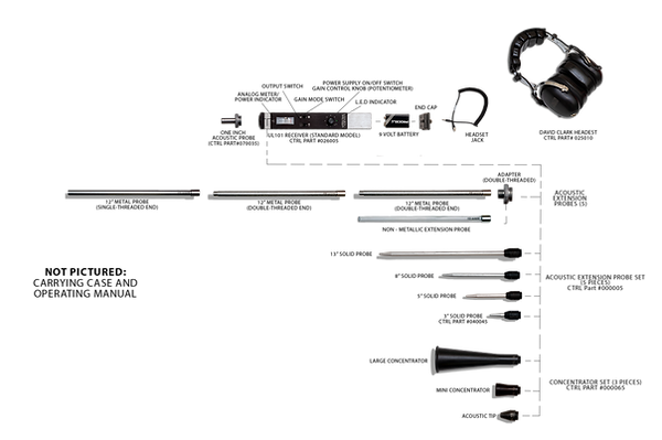 The CTRL UL101 Basic Kit includes attachments for airborne ultrasound applications including leak detection (any type of gas), vacuum leak detection, electrical inspection, and steam leak detection. Additionally, the kit includes a single 3-inch solid probe for diagnosing steam traps and valves by detecting internal bypass leaks